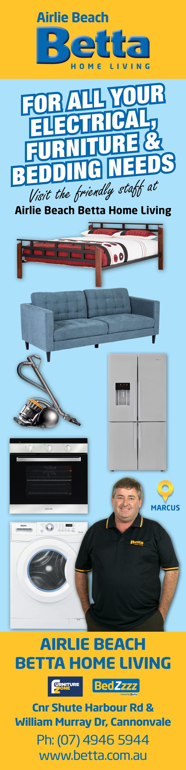 The Airlie Beach Betta Home Living store was established in 1991 and is currently owned and operated by Marcus Craig. At Airlie Beach Betta they love providing excellent service to their local community, making the purchasing, delivery & installation process easy & hassle free. Whether it be your next fridge, TV, air conditioner, heater or small appliance Betta Airlie Beach are your local experts. Marcus loves the community spirit and loyalty of the Airlie Beach region and currently sponsors the Proserpine Football Club, as well as making donations to the Proserpine Bowls Club, Proserpine RSL, the Whitsunday Crisis and Counselling, the Whitsunday Neighbourhood Centre, and all local schools. When he’s not at one of his son’s football or soccer matches, Marcus enjoys dining at the Airlie Beach Hotel and prefers his coffee white with one.