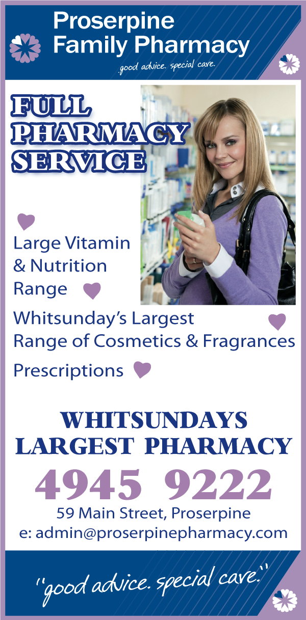 Proserpine Family Pharmacy is your local full service pharmacy offering the Whitsunday's largest range of cosmetics, fragrances, vitamins and nutrition products. Our highly knowledgeable and experienced pharmacy team offer expert advice and will fill all your prescription needs.