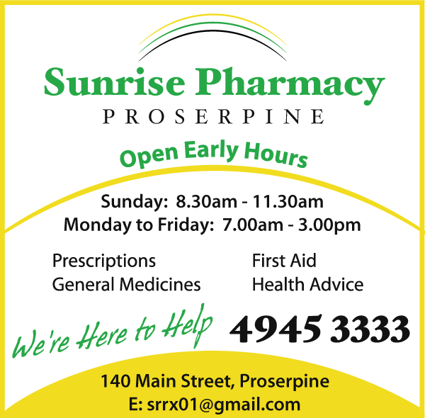 Sunrise Pharmacy Proserpine is here to help for your health and well-being needs. Open early hours from 7am Monday to Friday, and Sundays from 8:30am, our qualified and caring team can manage your prescriptions, general medicines, first aid needs and offer expert health advice.
