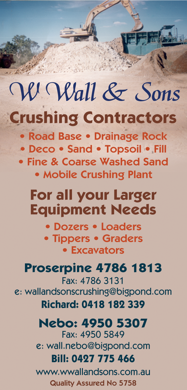 See W Wall and Sons crushing contractors for all your road base, drainage rock, deco, sand, topsoil, fill, fine and coarse washed sand supplies. We offer a mobile crushing plant and larger equipment for all your earthmoving and landscaping needs!