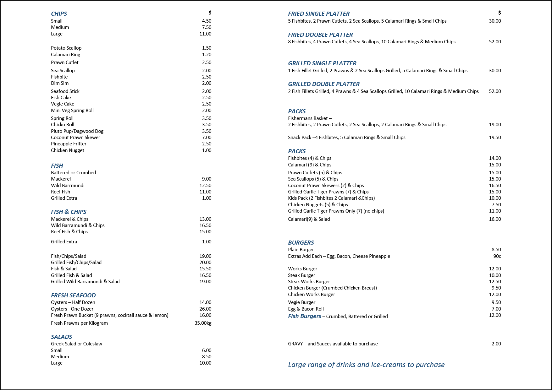 Select from a wide range of fresh local caught fish and seafood - grilled, crumbed or battered to your liking, and pair with some crunchy chips. A perfect quick and tasty meal to enjoy on the beach or take home for an easy dinner.