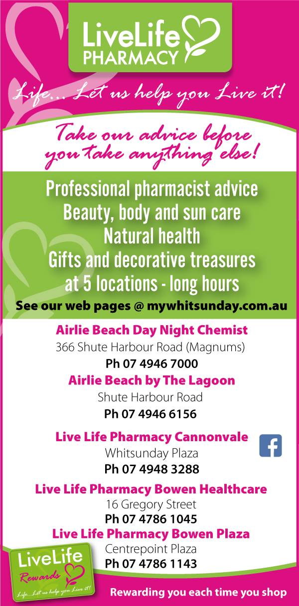 Live Life – life, let us help you live it! The motto says it all. Live Life Pharmacies are spread across local communities in NSW and Qld, with two in The Whitsundays in Airlie Beach and in Cannonvale at Whitsunday Plaza.