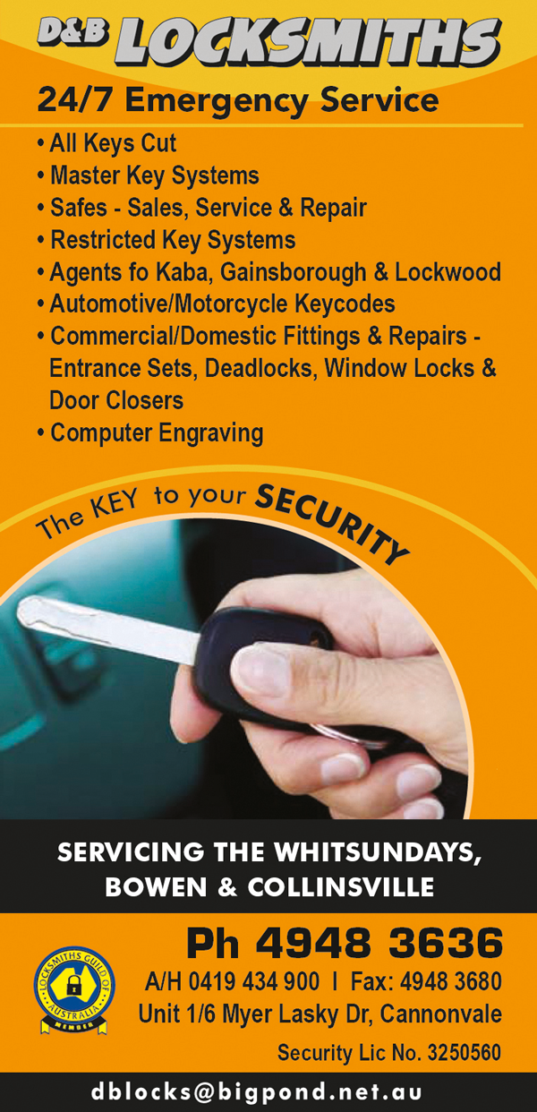 D&B Locksmiths are your local professional locksmiths servicing both commercial and domestic clients in the Whitsunday region. We are the experts in all aspects of keys and security, and offer a 24/7 emergency service for your convenience!