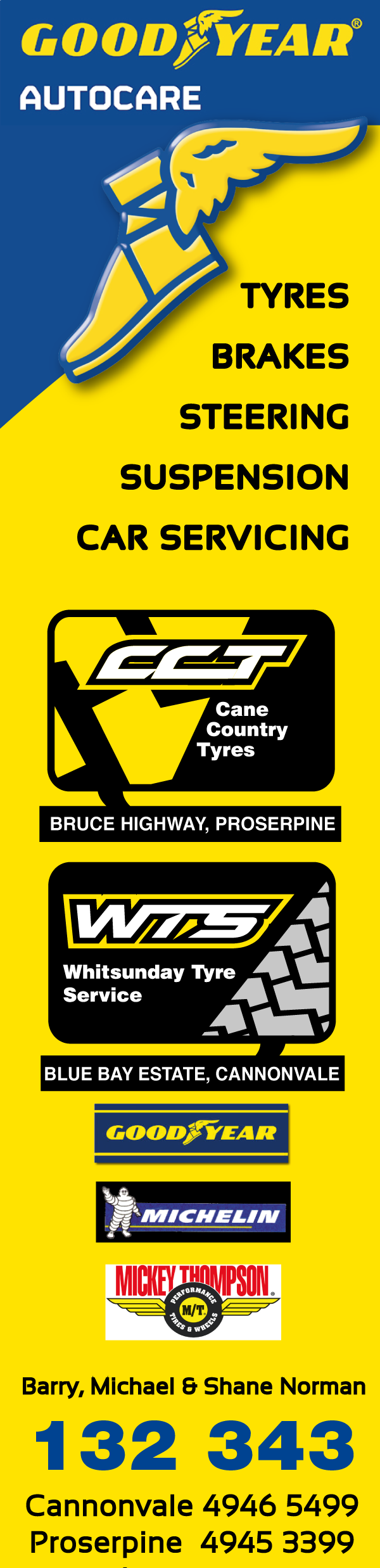 Goodyear Autocare is an elite 'One Stop Shop" for tyres, car servicing and mechanical repairs. Whitsunday Tyre Service is your local Goodyear Autocare service centre offering a wide range of quality leading brand tyres for all your vehicle needs, including passenger tyres, 4WD and RV tyres, light commercial tyres, agricultural tyres and truck tyres.