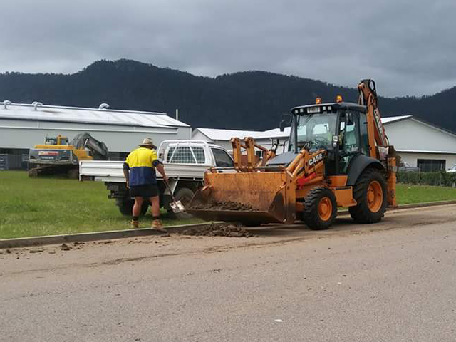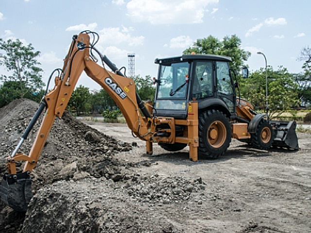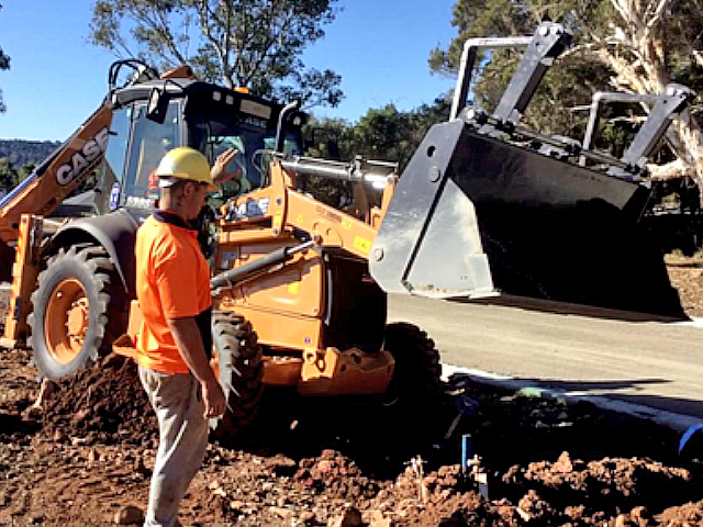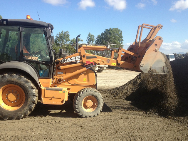 His equipment includes multi-sized buckets, extender hoe and forks.