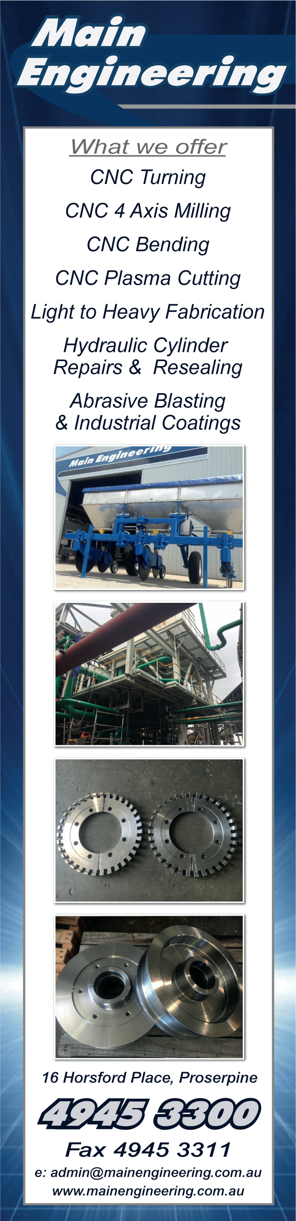 Main Engineering is the largest engineering workshop in the Whitsundays. Our quality workmanship and personal service mean that we are able to deal with any job, large or small; we pride ourselves on our ability to handle large productions or a one off request.