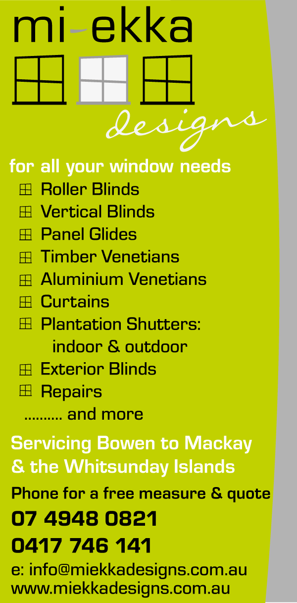 Mi-Ekka designs is an established local business that offers quality products and quality service. Our range of window furnishings is vast with many options available. We also offer maintenance and repairs. From Cannonvale to Mackay, Bowen and the Whitsunday islands. All our solutions are made to measure, with a wide selection of products from quality brand names. If you have a window, we have a solution.