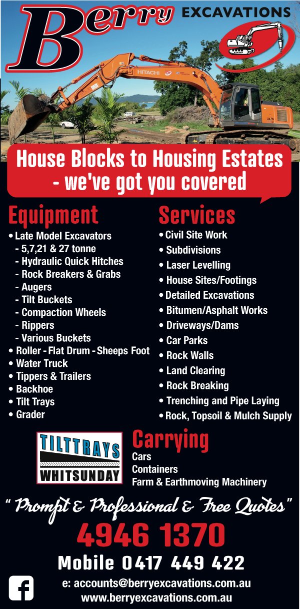 We will save your project valuable time and money. Use Berry Excavations with complete confidence. We are backed by a local, family owned business, operating in the Mackay and Whitsundays region for 22 years.
