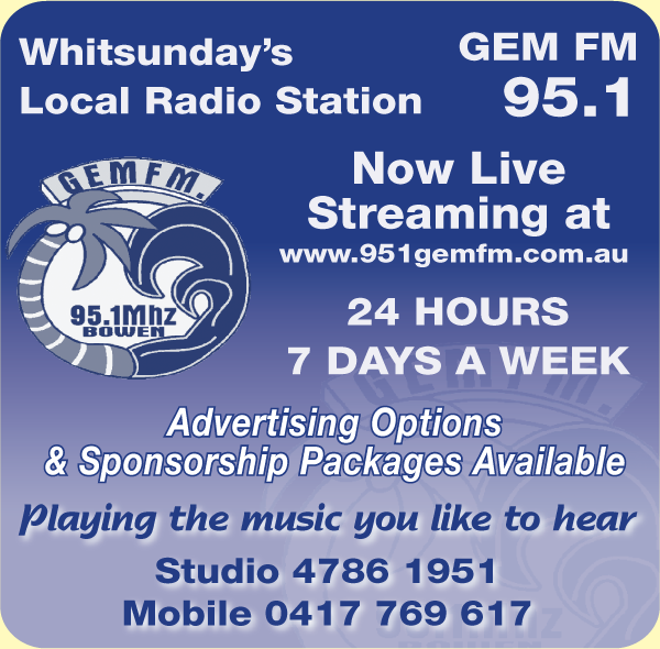 Whitsundays local radio station, live, loud and now streaming online at www.951gemfm.com.au or on 95.1FM. Broadcast 24 hours a day, 7 days a week.